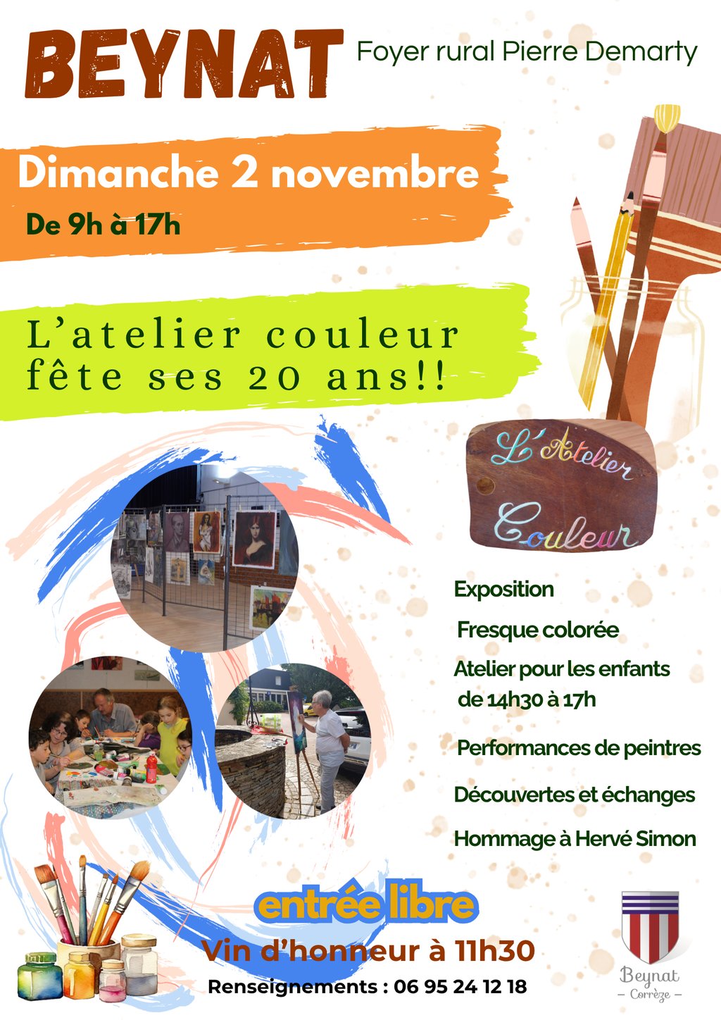 Le dimanche 2 novembre de 9h à 17h, l’association beynatoise de dessins et de peintures « L’atelier couleur » va fêter ses 20 ans au foyer rural Pierre Demarty.