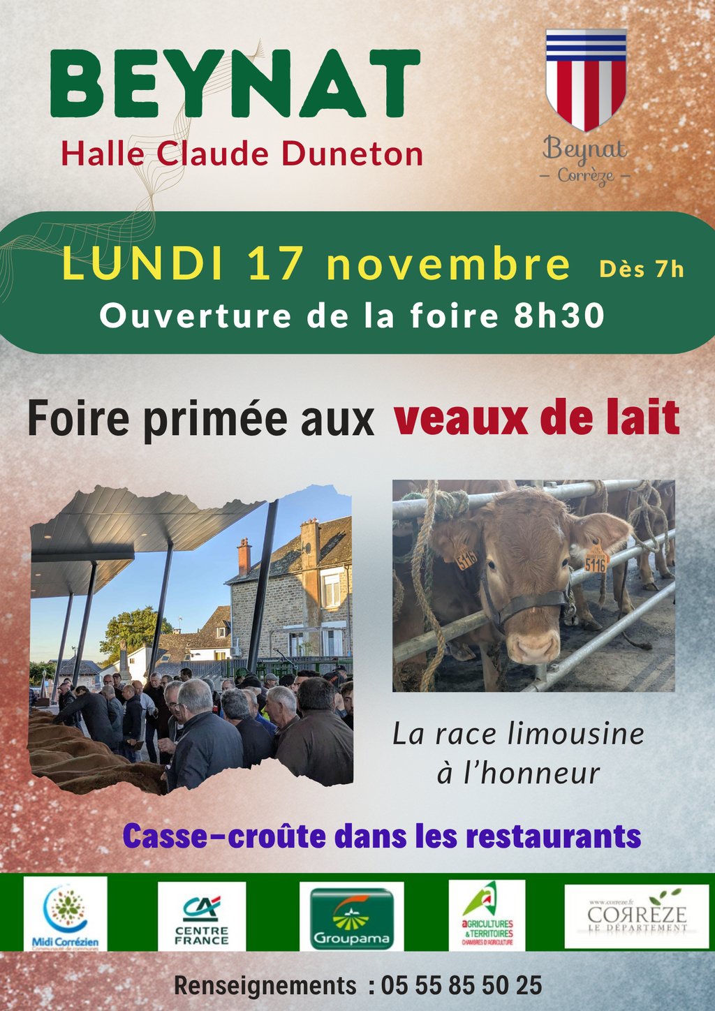 Après celle du 3 novembre (qui rappelons-le devait initialement se tenir à Beaulieu sur Dordogne), Beynat va de nouveau accueillir une foire primée aux veaux de lait le lundi 17 novembre au matin.