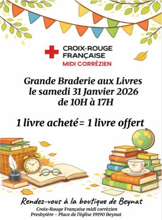 Le samedi 31 janvier de 10h à 17h, la Croix Rouge Française « Midi Corrézien » organise une grande braderie aux livres : 1 livre offert pour un livre acheté . Rendez-vous à la boutique solidaire de Beynat (au presbytère, place de l'église) pour profiter de cette opération.