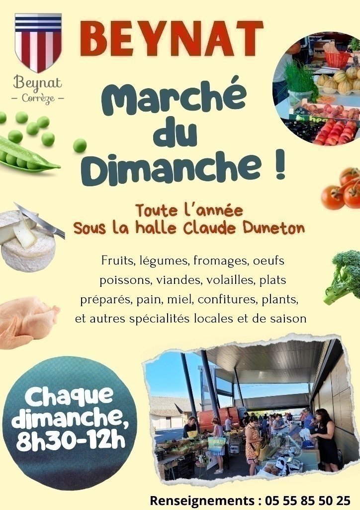Le marché hebdomadaire et alimentaire de Beynat a lieu de 8h30 à 12h sous la Halle Claude Duneton.