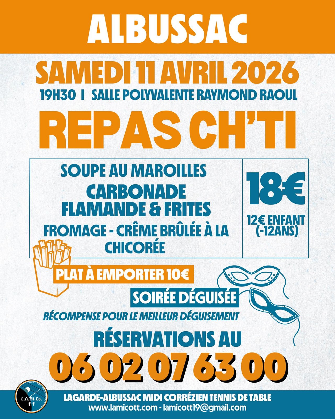 Réservations : 06 02 07 63 00 - lamicott19@gmail.com https://bit.ly/repas-chti-2026 -